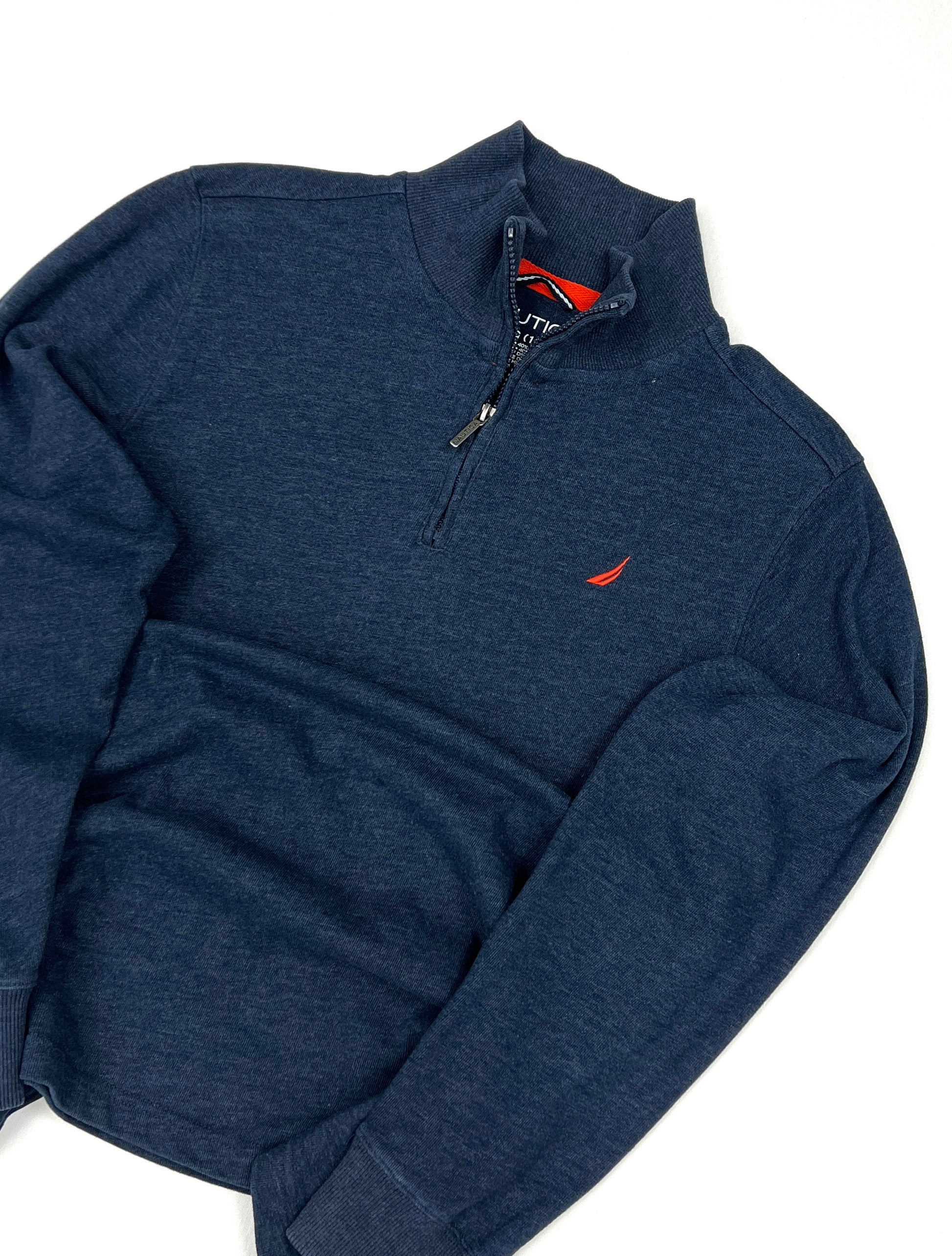 Sudadera half zip Nautica de segunda mano en color azul marino, una prenda versátil que combina estilo deportivo y estética clásica americana. Confeccionada en tejido cómodo y resistente, ideal para looks casuales o para completar outfits de entretiempo.