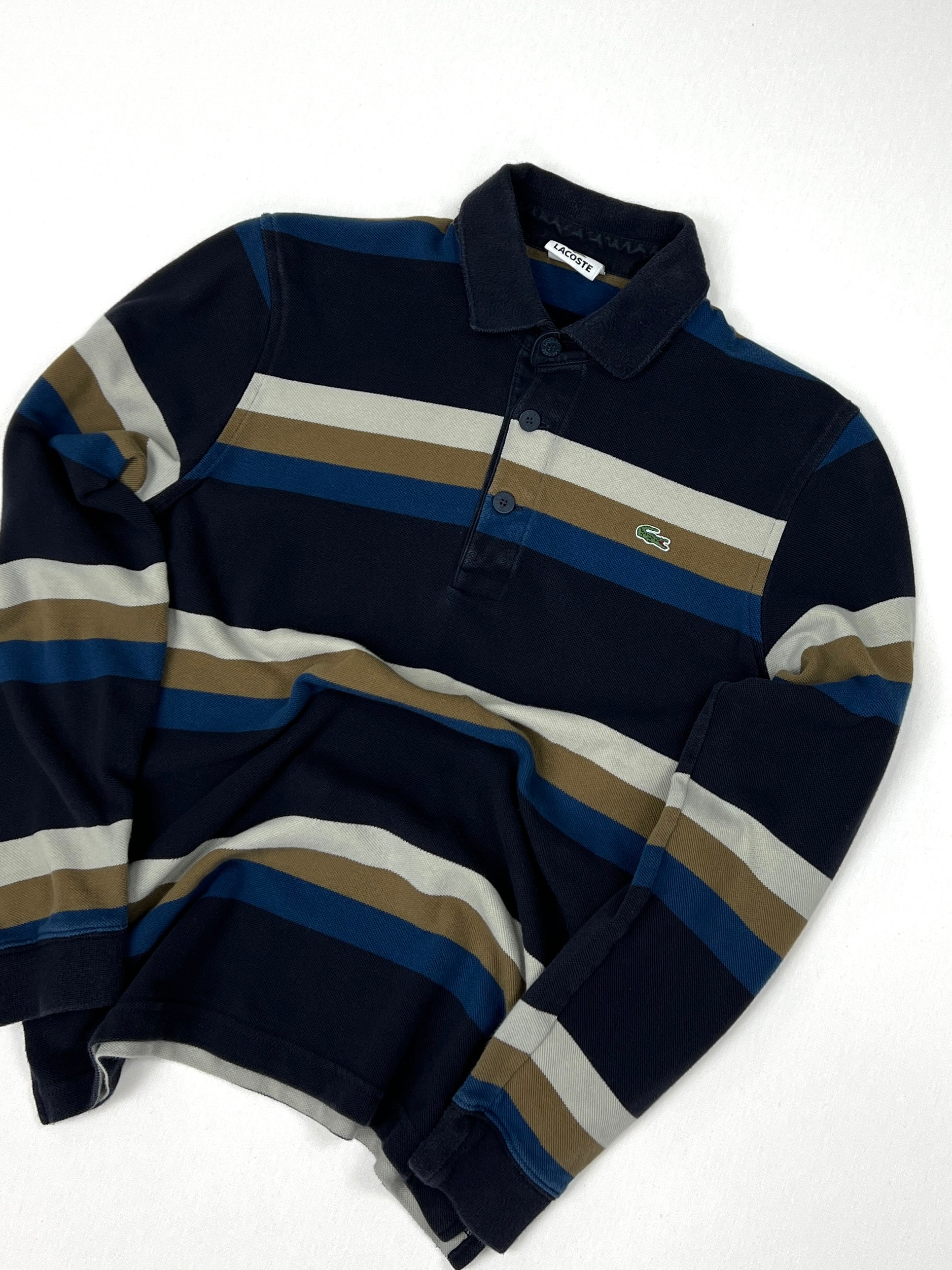 Polo rugby Lacoste de segunda mano con diseño a franjas en tonos azul marino, azul, marrón y gris, una combinación elegante y equilibrada que refleja el estilo clásico y deportivo de la marca. Confeccionado en tejido resistente y cómodo, característico de los polos rugby, ideal para looks casuales con un toque vintage.