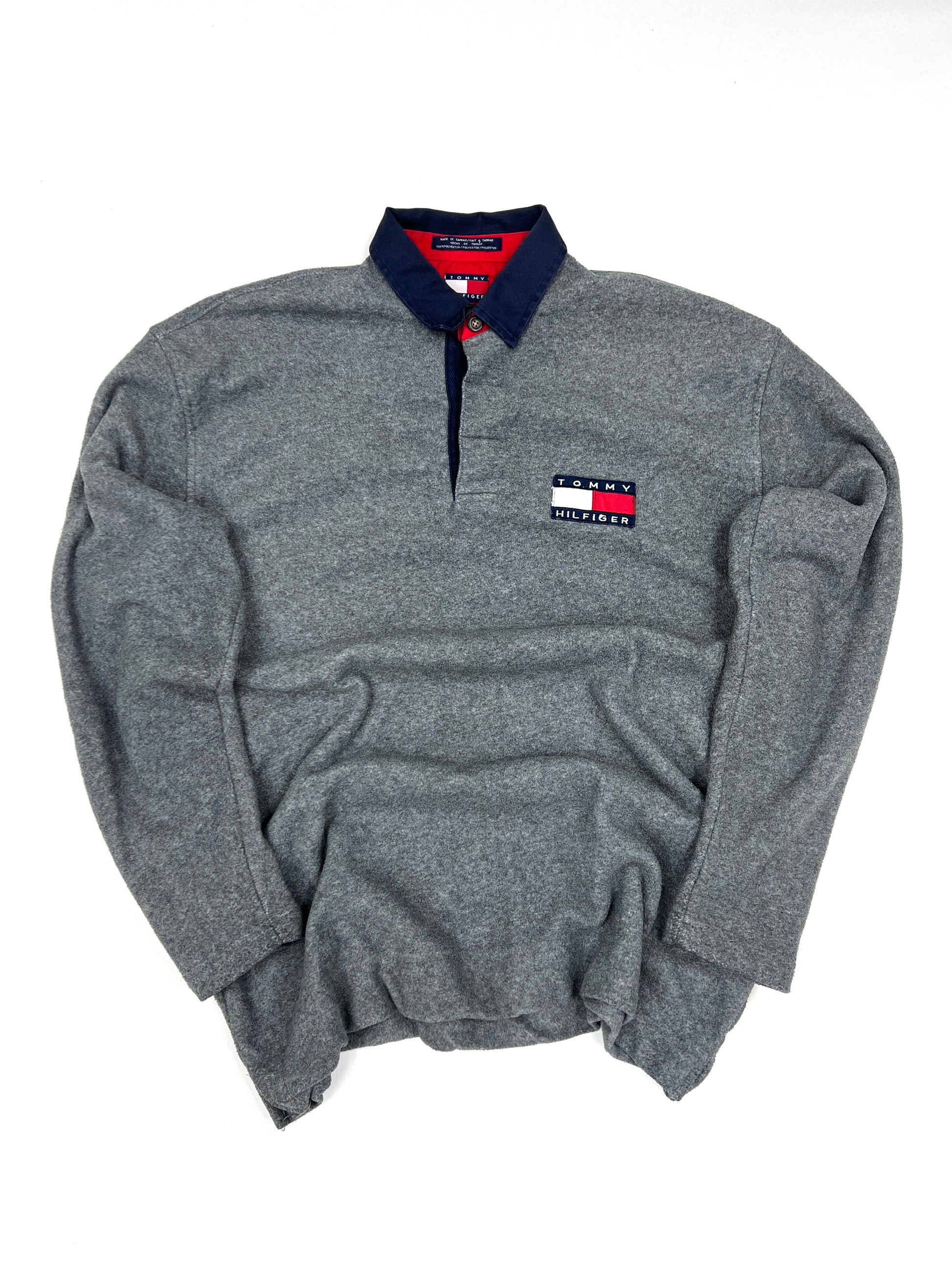 Polo rugby polar Tommy Hilfiger de segunda mano en color gris, una prenda cómoda y cálida ideal para looks casuales y deportivos. Perfecta para días frescos o como capa superior en estilo streetwear.
